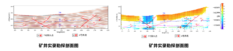 图一:在7#突水点至6#井底测线剖面图上,共揭露断层9条。9条均为正断层,断层倾角在20°至55°,倾向基本为SW和NE方向,断距在3.2-8.8米之间,平均5.1米。