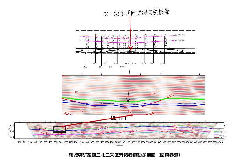与近期巷道掘进写实剖面对比:剖面地质解释的局部,小向斜宽度(约20米)、落差(1.5-2米),位置基本吻合