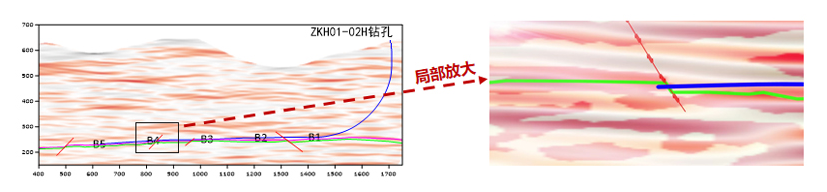 分析认为该水平井最终穿过了一处正断层,断距约3.4米,由下降盘进入上升盘,因此进入煤层,即钻井记录:1288.00~1291.43m,黑色煤,剖面中显示进入上升盘约3.5米。
