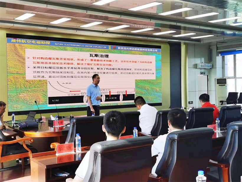 我公司总工程师、物探专家赵教授讲解了威特电磁航空勘探(NEMV)技术原理、应用对龙湖矿威特勘探成果进行了汇报;董事长李明就煤矿安全综合治理同与会人员进行交流