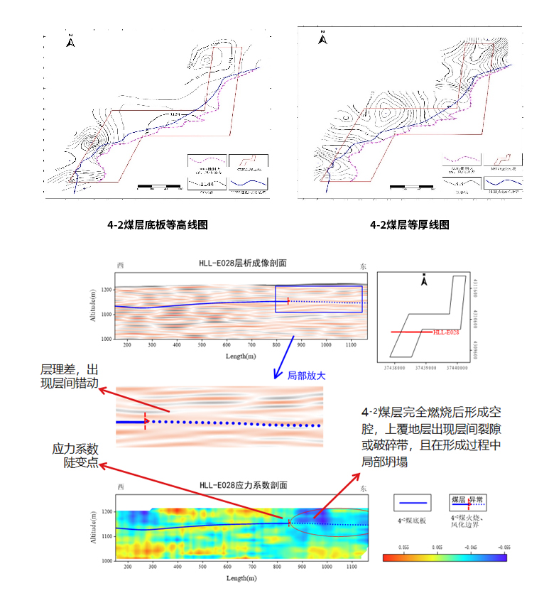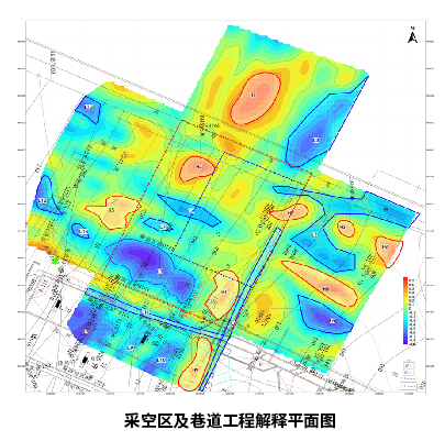 将本次勘探解释划分应力异常区域23个,其中采空区/疑似采空区10个,保护煤柱4个,采掘巷道2个,天然高/低应力区7个。将解释的应力异常划分区域与3号煤底板工程图相叠加对比分析(左图),解释成果准确度达到90%以上,具体对比解释结果如上图