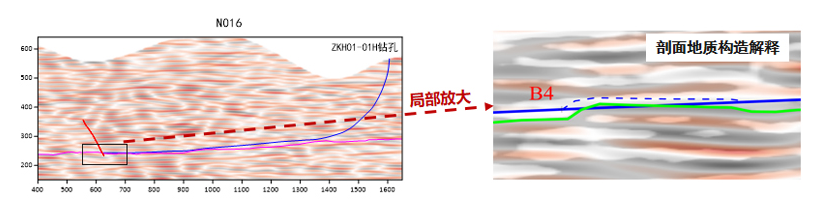 与近期巷道掘进写实剖面对比:剖面地质解释的局部,小向斜宽度(约20米)、落差(1.5-2米),位置基本吻合