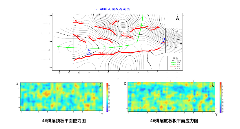 图二:结合L1区域地处凿开河,且表现较低的应力异常,推断含水区表现为低值异常区。F2断层上至地表附近,下部进入奥陶系灰岩,穿过L1、L2、L3低值异常区。推测F2断层导通奥灰水,形成7#突水点的水来源通道,且F2断层也有可能导通上覆地层至地表凿开河。F6断层底部穿过L4低值区,可能形成导水通道,且6#井底NE方向L4周围低值异常明显。