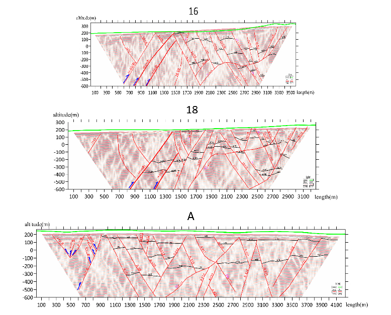 对三条测线32#、39#、46#、48#煤层的分布情况进行分析研究,测线区域内发育多套薄煤层,煤层发育连续性较差,均存在缺失现象,受断层影响,煤层起伏变化强烈,构造起伏较大,与当地煤层分布大背景构造契合。