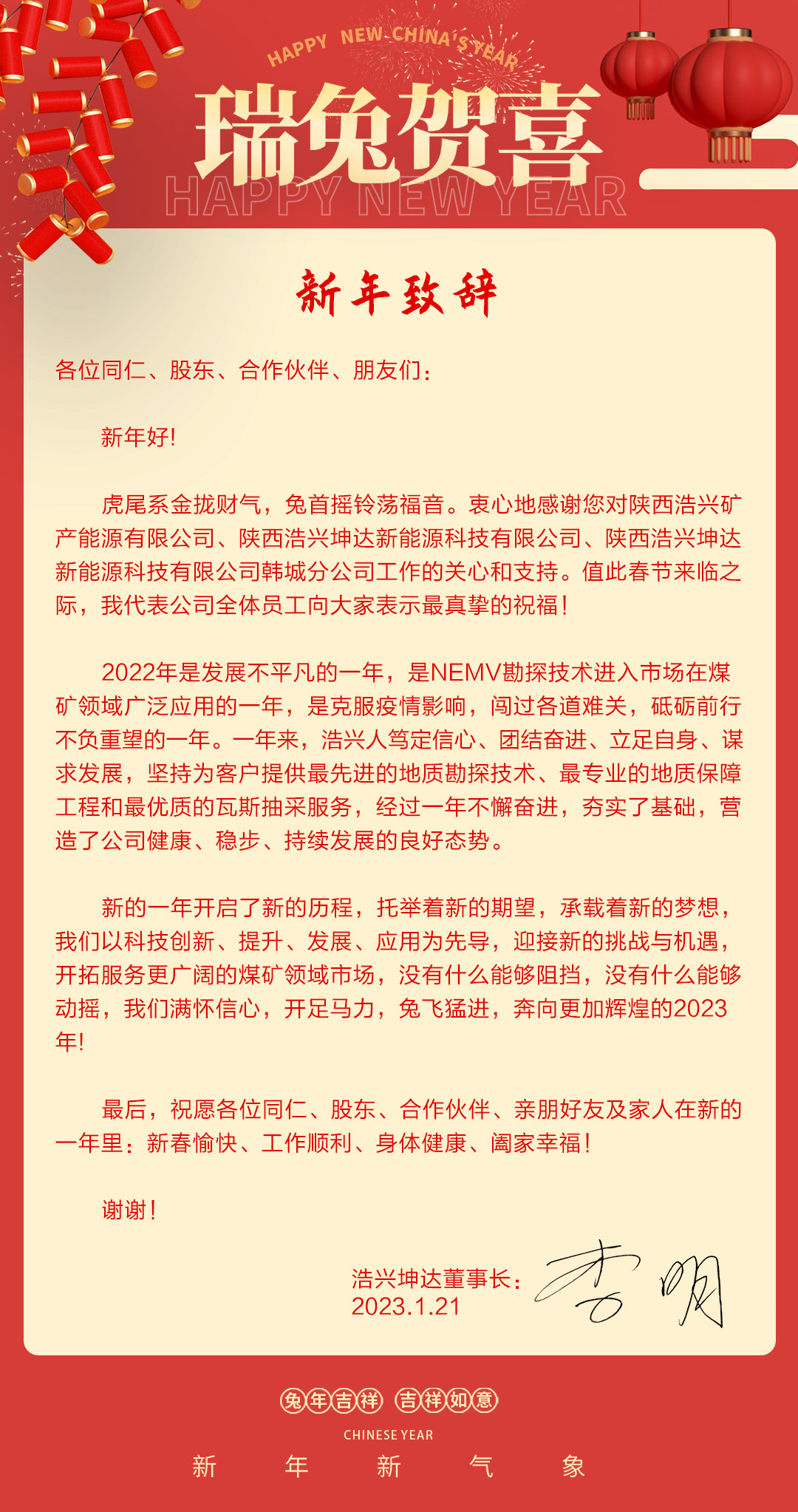 浩兴坤达董事长2023年新年致辞